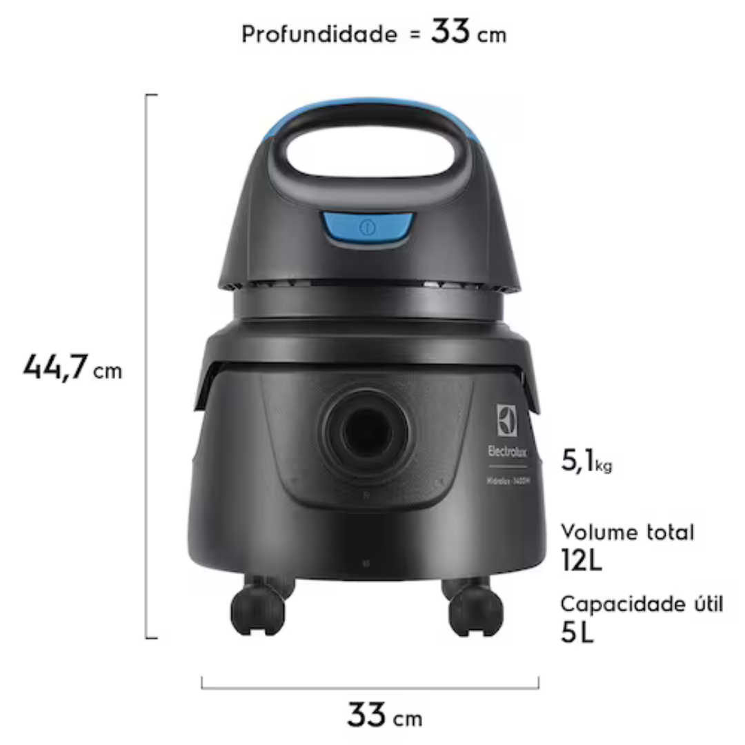 O Aspirador de Pó e Água Hidrolux AWD01 é a solução ideal para suas limpezas residenciais. Com um motor potente de 1400W, ele garante um alto poder de sucção, perfeito para aspirar tanto resíduos sólidos quanto líquidos. Sua capacidade útil de 5L permite limpezas extensas, sem a necessidade de esvaziar o recipiente a todo momento. Para tarefas maiores, o volume total de 12L do recipiente oferece flexibilidade extra.
